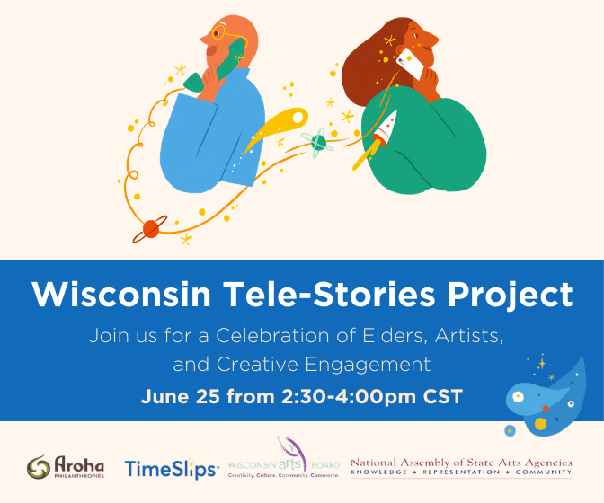 The Arts Board received a Leveraging State Investments in Creative Aging grant in from the National Assembly of State Arts Agencies, funded by Aroha Philanthropies. With these funds, the Arts Board partnered with TimeSlips to create the Wisconsin Tele-Stories Project. The Aging and Disability Resource Centers (ADRC) of Central Wisconsin and Brown County engaged four artists to work with older adults in their regions. Click on the WI Tele-Stories Project image to the right to access the final showcase recording.