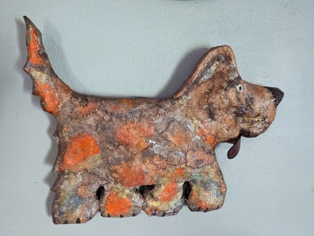 What can Mary Lou Krase tell you about her art? She finds beauty in the discarded and the battered. Recycling was instilled in her while working as an art student at UW-Madison making paper from rags under the guidance of Professor Walter Hamady. She rescues old window shutters and makes them movable fish; discarded hubcaps on the streets become lit up collaged stories; scraps of wood are shaped with paper and become rescued animals and old discarded windows are portraits of creativity. The challenges are endless and of course discarded items are plentiful.