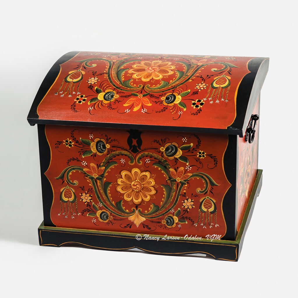 What excites me the most is that I am seeing a Rosemaling revival, where younger artists in Wisconsin are opening their minds to a new and different way of approaching this art form, while still honoring the traditions of the old master’s from Norway. They can study with exceptional instructors that are passionate about Rosemaling and where there is a free flow of ideas and discovery during their yearlong artistic journey of enlightenment and inventiveness. No longer do they need to rely upon designs created by contemporary artists but can create finished pieces using their own designs or rosemaling ‘free hand’. They use their own voice when translating what they see in the old works, and what they have learned during their apprenticeship, and their completed work is an inspiration to all. These young artists are curious about techniques, paint colors and how the design elements were interpreted from area to area in Norway and by each artist. During and after their apprenticeship, they are traveling to museums in the United States and Norway to view collections of Scandinavian artifacts or to learn from Norwegian Artists. I am proud to be a part of this revival, where artistic expression flows out from our very soul and where this art form can live and breathe as it is carried forward into the next generation of Rosemalers here in Wisconsin and beyond.